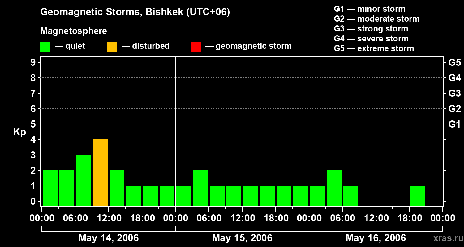 Changes in the geomagnetic index Kp from May 14 to 16, 2006 for mid latitudes