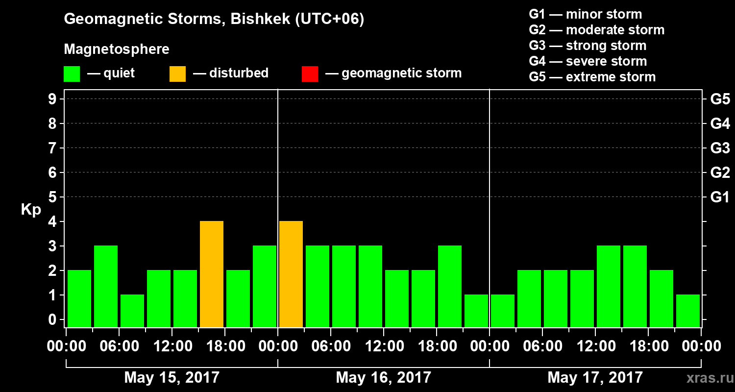 Changes in the geomagnetic index Kp from May 15 to 17, 2017 for mid latitudes