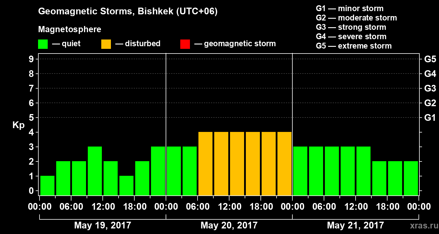 Changes in the geomagnetic index Kp from May 19 to 21, 2017 for mid latitudes