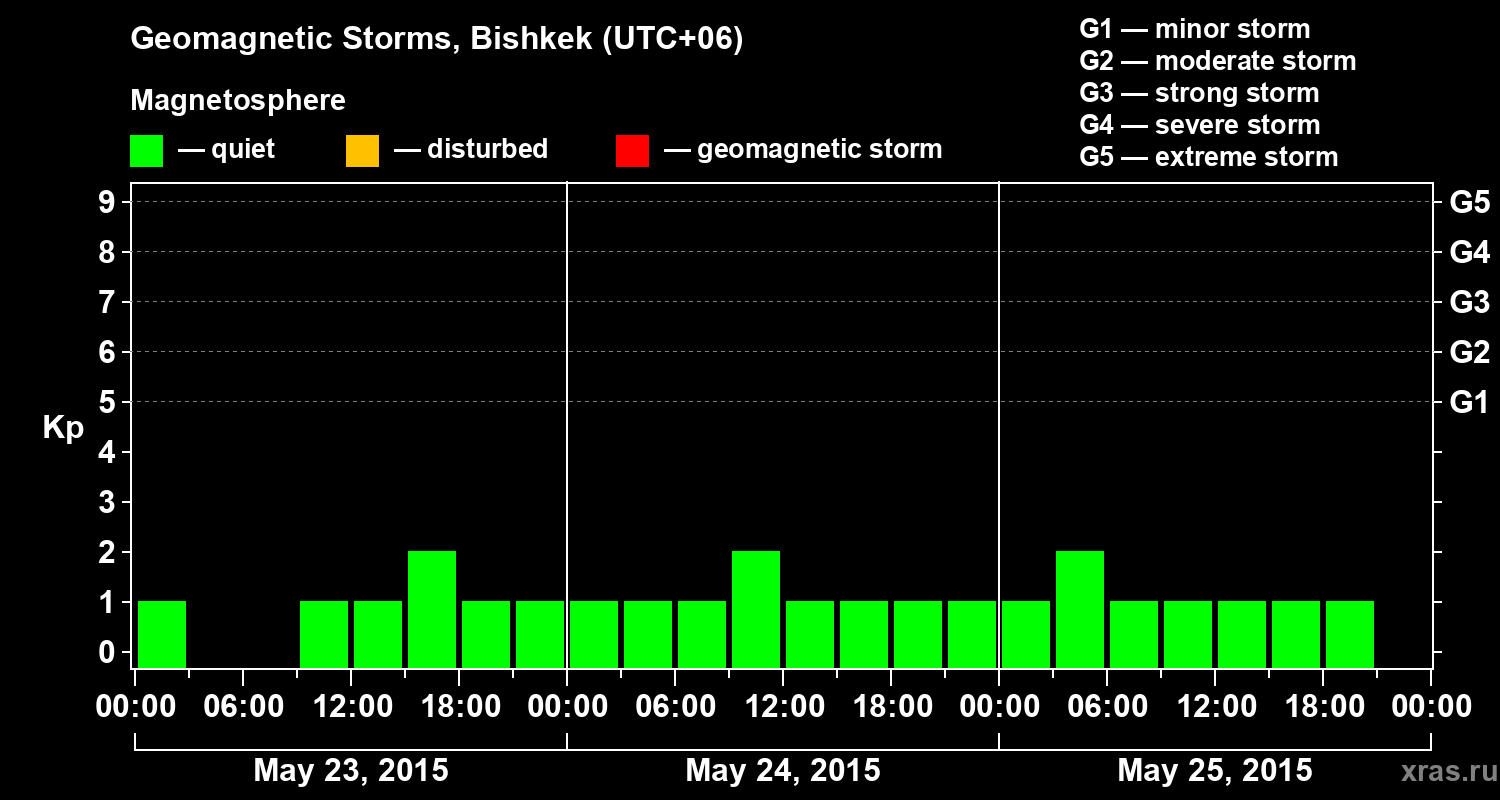 Changes in the geomagnetic index Kp from May 23 to 25, 2015 for mid latitudes