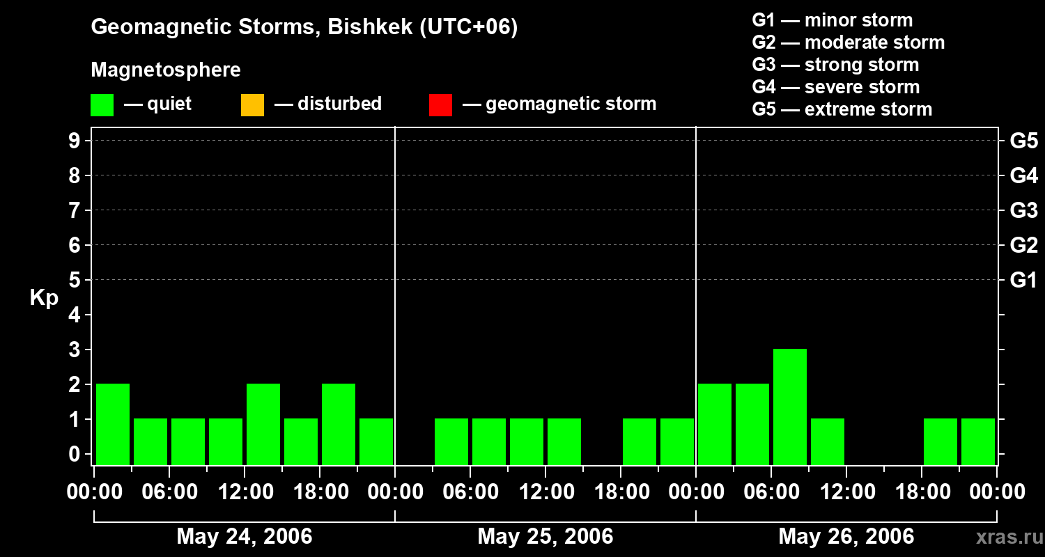Changes in the geomagnetic index Kp from May 24 to 26, 2006 for mid latitudes