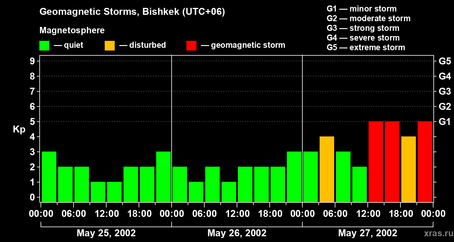 Changes in the geomagnetic index Kp from May 25 to 27, 2002 for mid latitudes