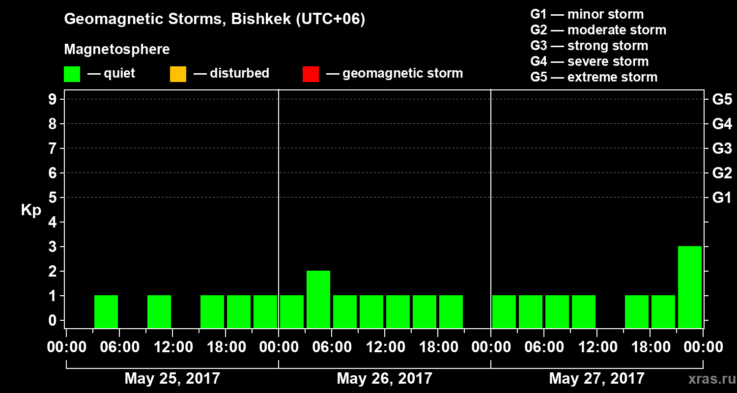 Changes in the geomagnetic index Kp from May 25 to 27, 2017 for mid latitudes