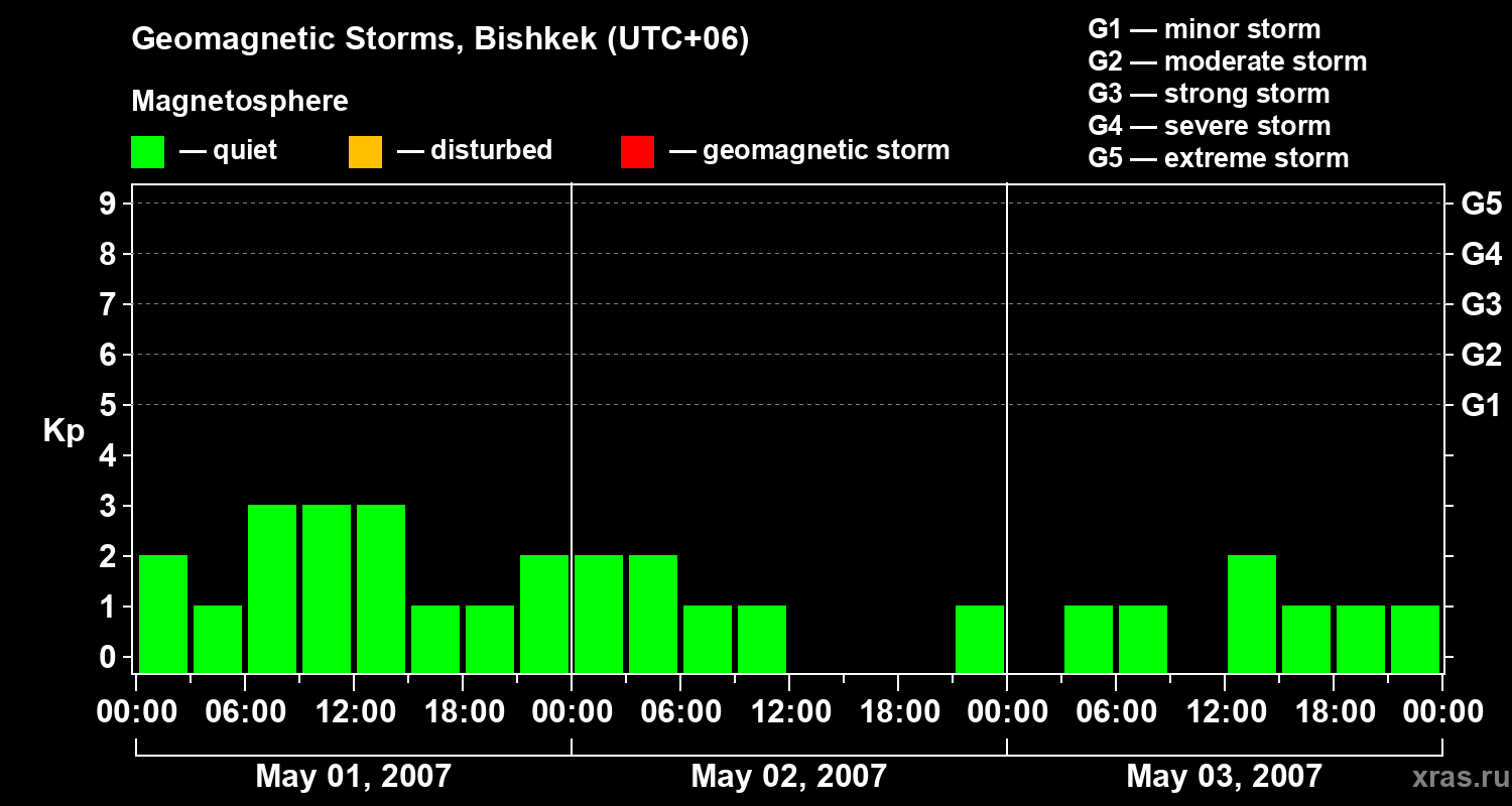 Changes in the geomagnetic index Kp from May 1 to 3, 2007 for mid latitudes