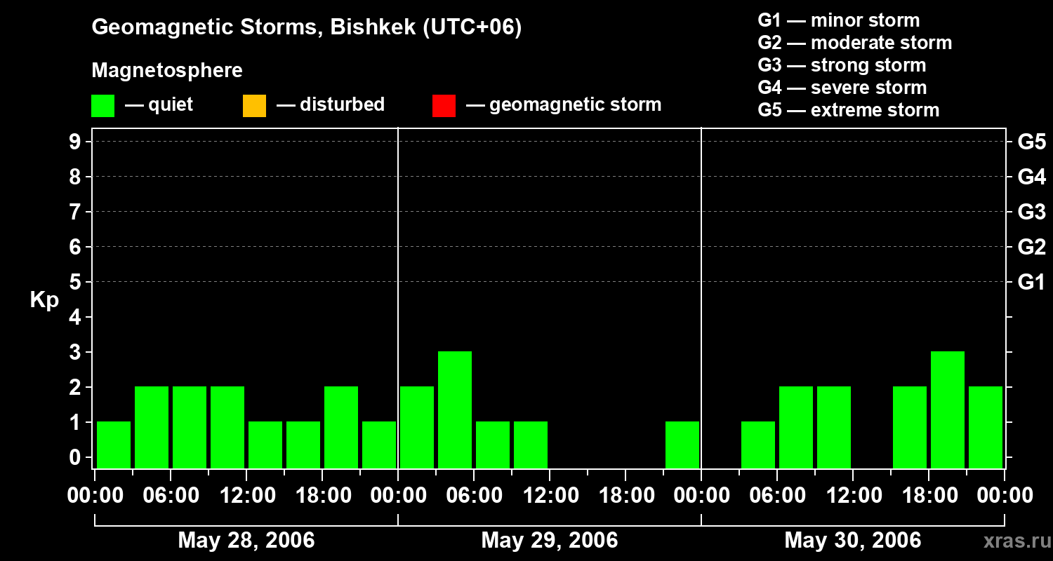 Changes in the geomagnetic index Kp from May 28 to 30, 2006 for mid latitudes