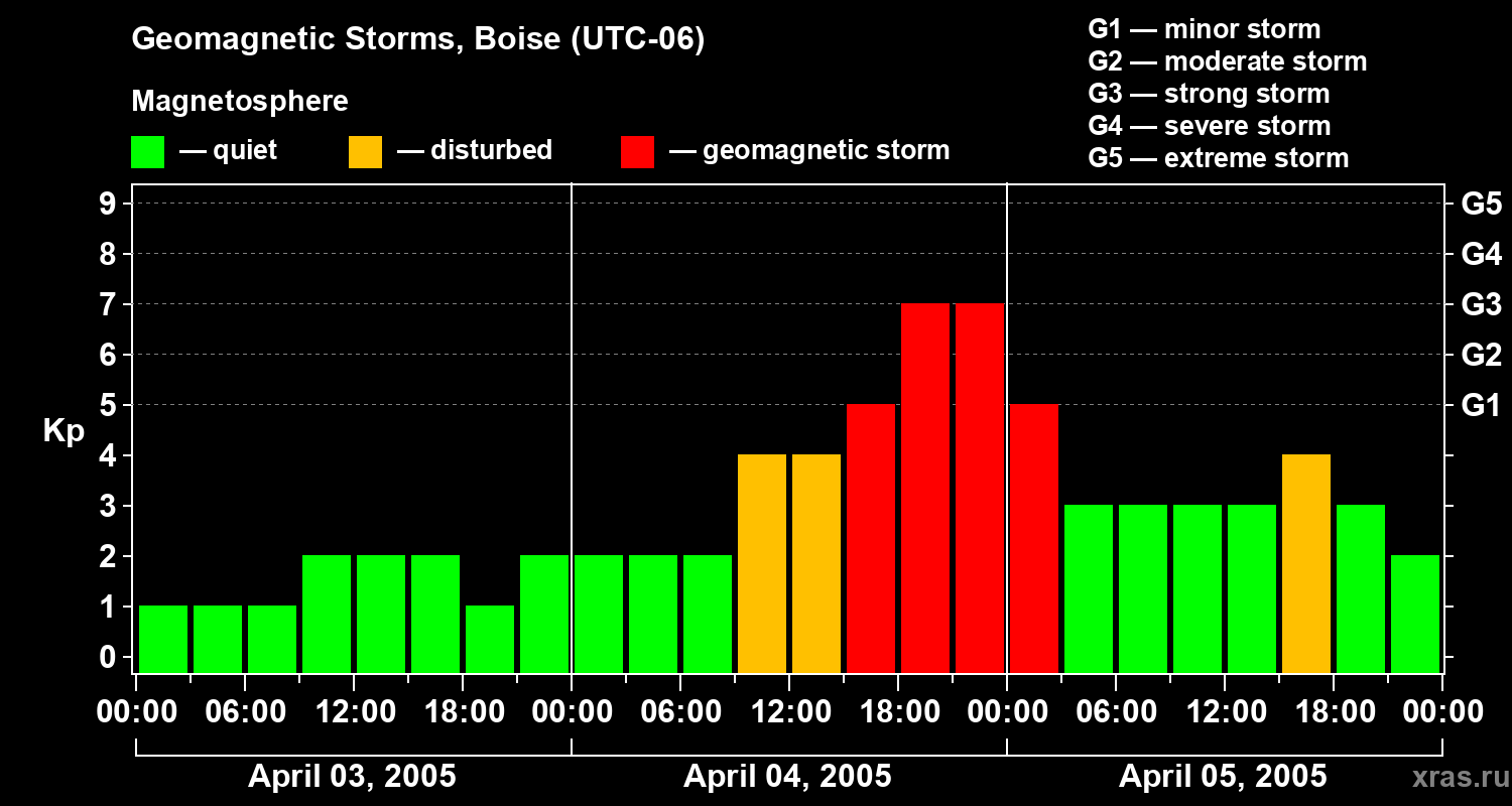 Changes in the geomagnetic index Kp from April 3 to 5, 2005 for mid latitudes
