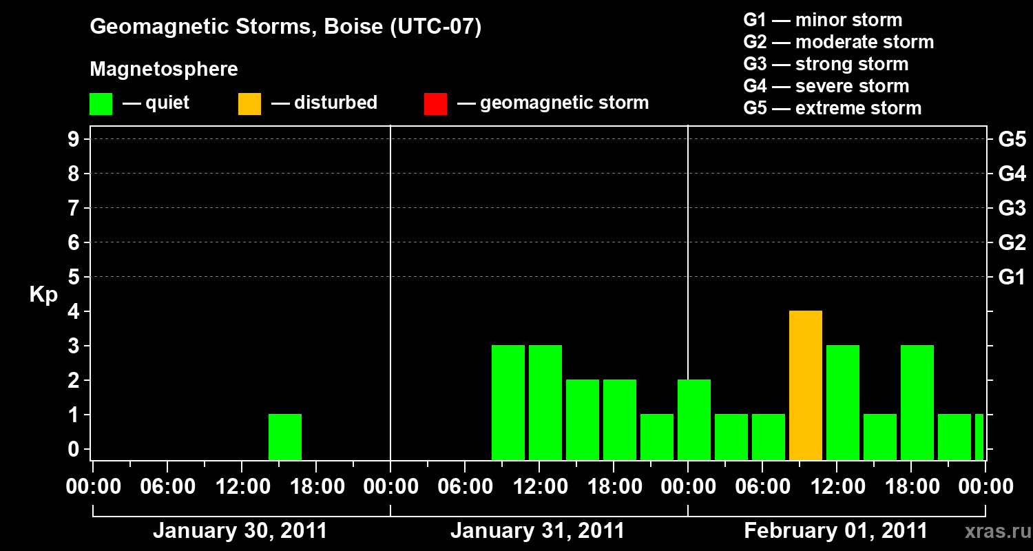 Changes in the geomagnetic index Kp from January 30 to February 1, 2011 for mid latitudes