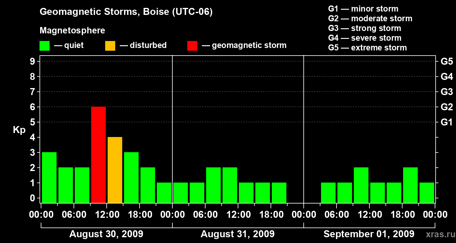Changes in the geomagnetic index Kp from August 30 to September 1, 2009 for mid latitudes