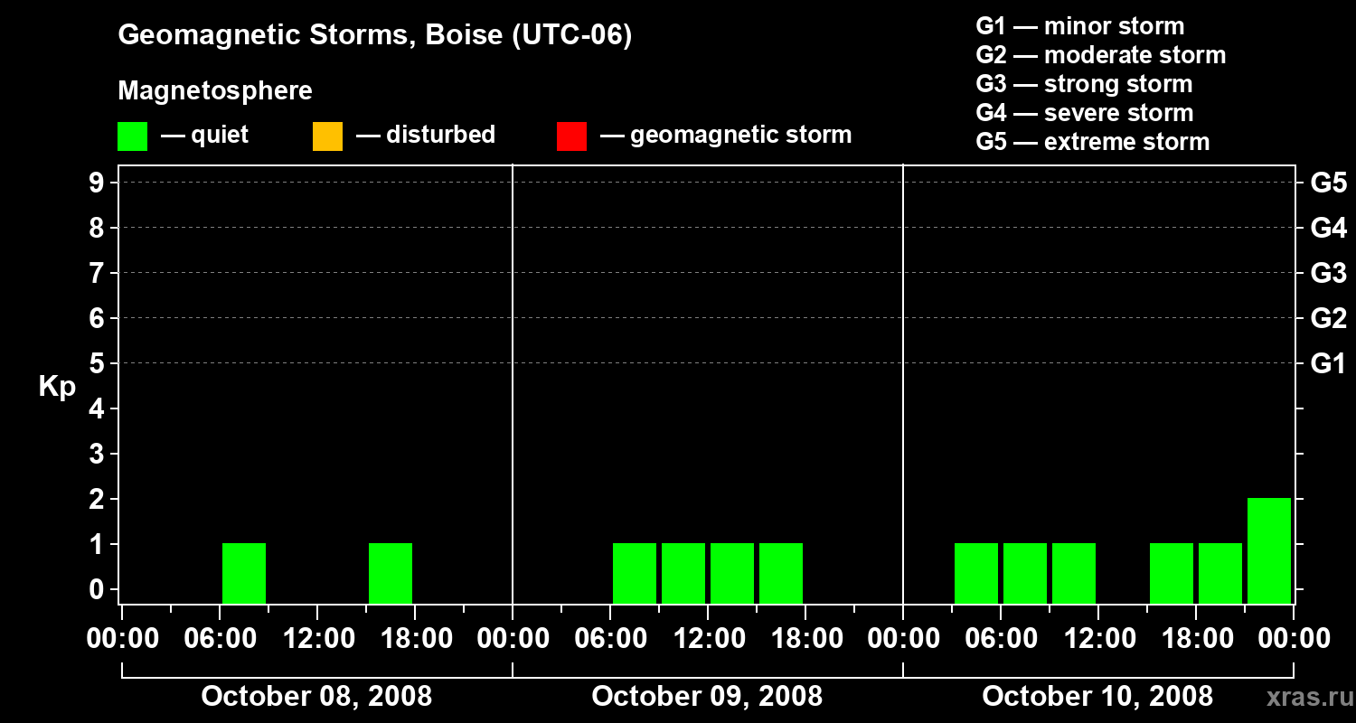 Changes in the geomagnetic index Kp from October 8 to 10, 2008 for mid latitudes
