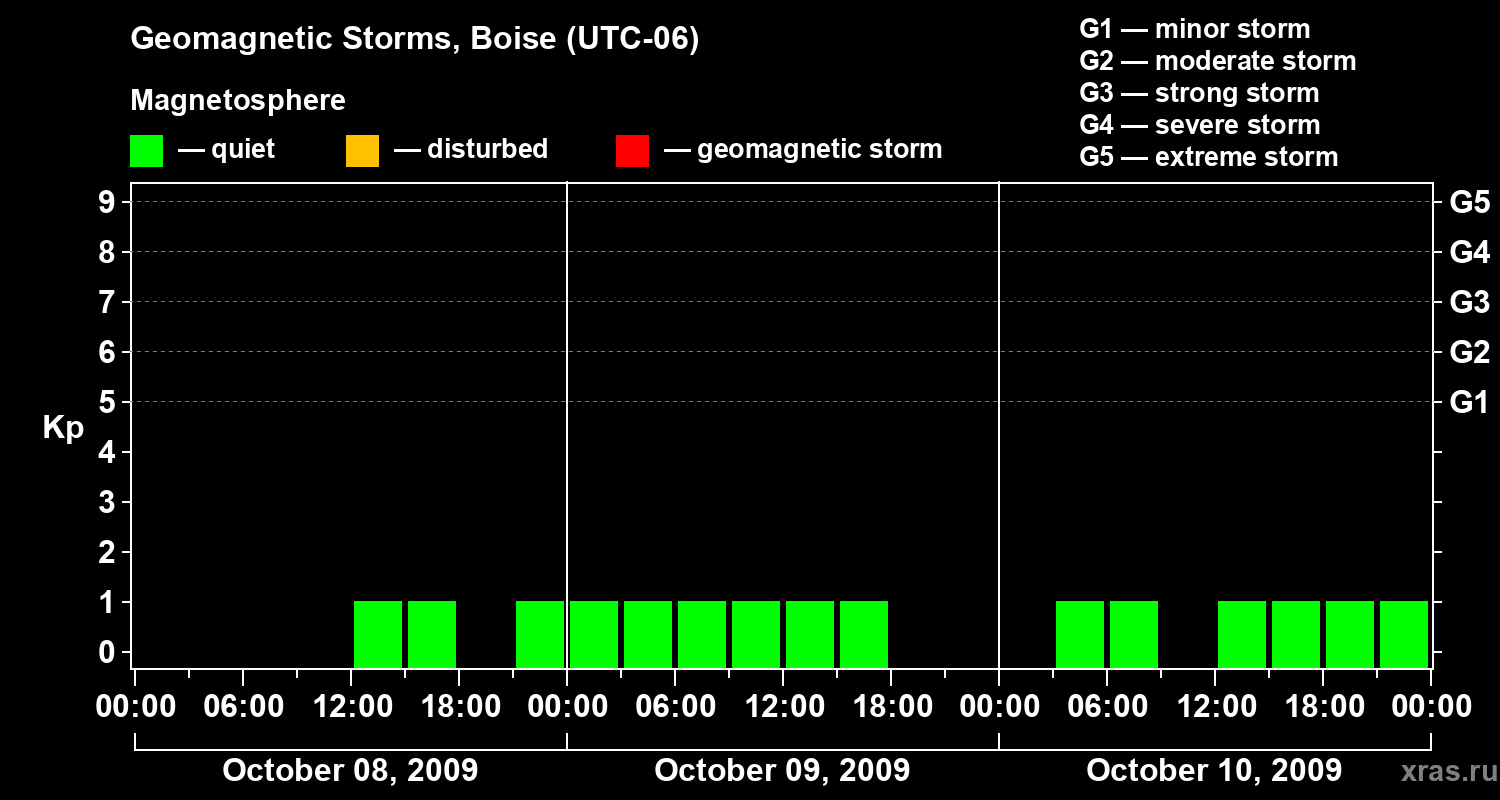 Changes in the geomagnetic index Kp from October 8 to 10, 2009 for mid latitudes