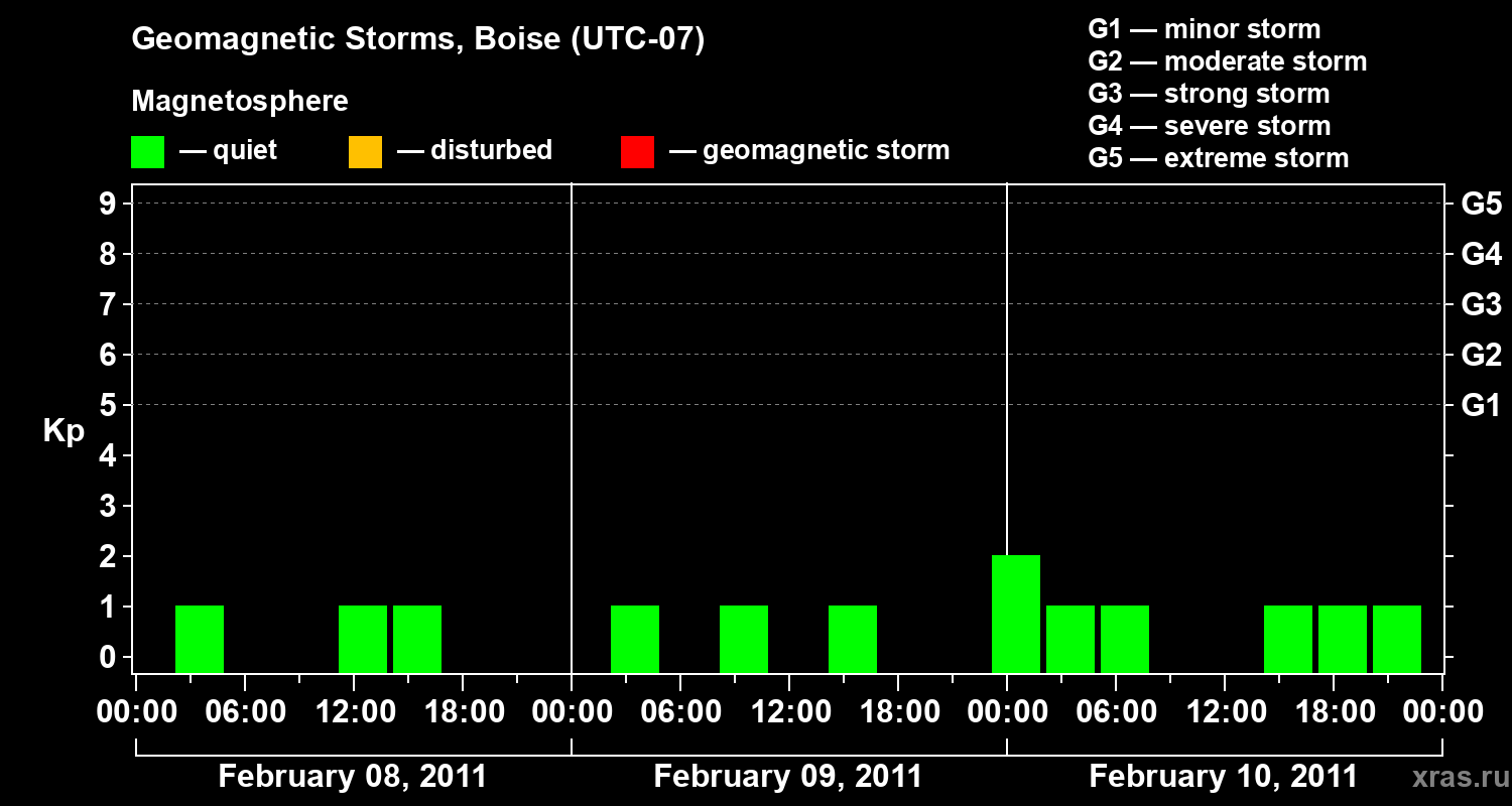 Changes in the geomagnetic index Kp from February 8 to 10, 2011 for mid latitudes