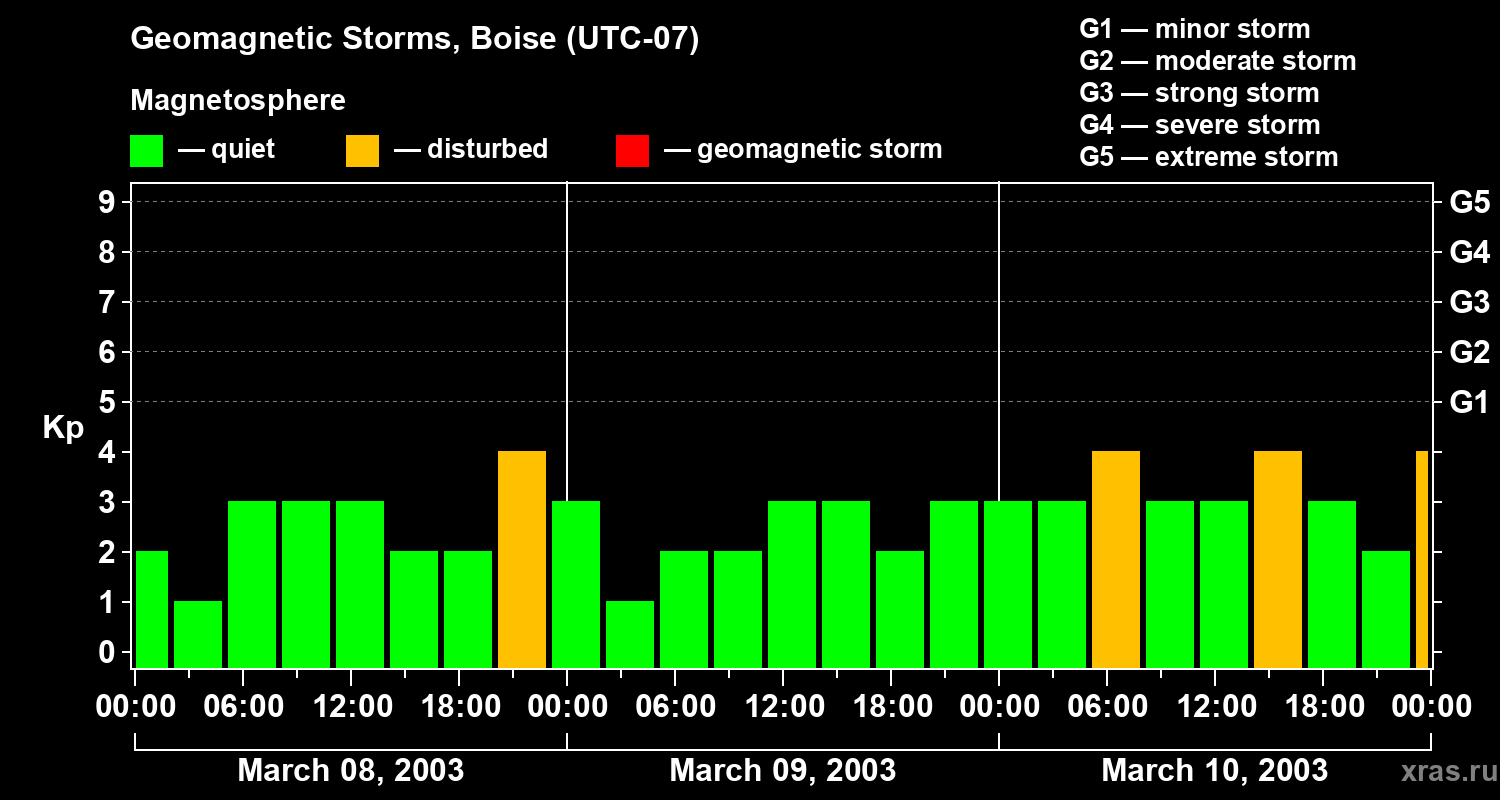 Changes in the geomagnetic index Kp from March 8 to 10, 2003 for mid latitudes