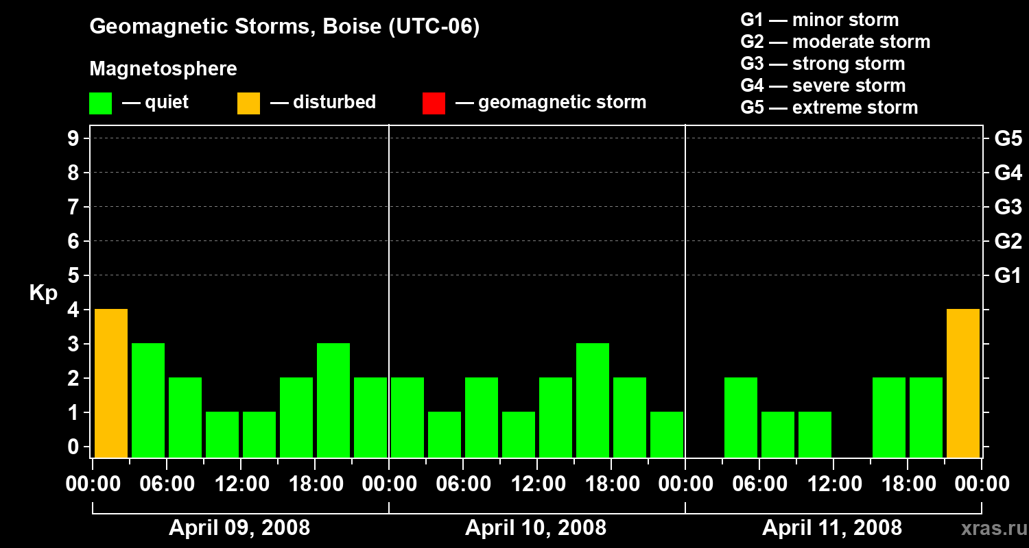 Changes in the geomagnetic index Kp from April 9 to 11, 2008 for mid latitudes