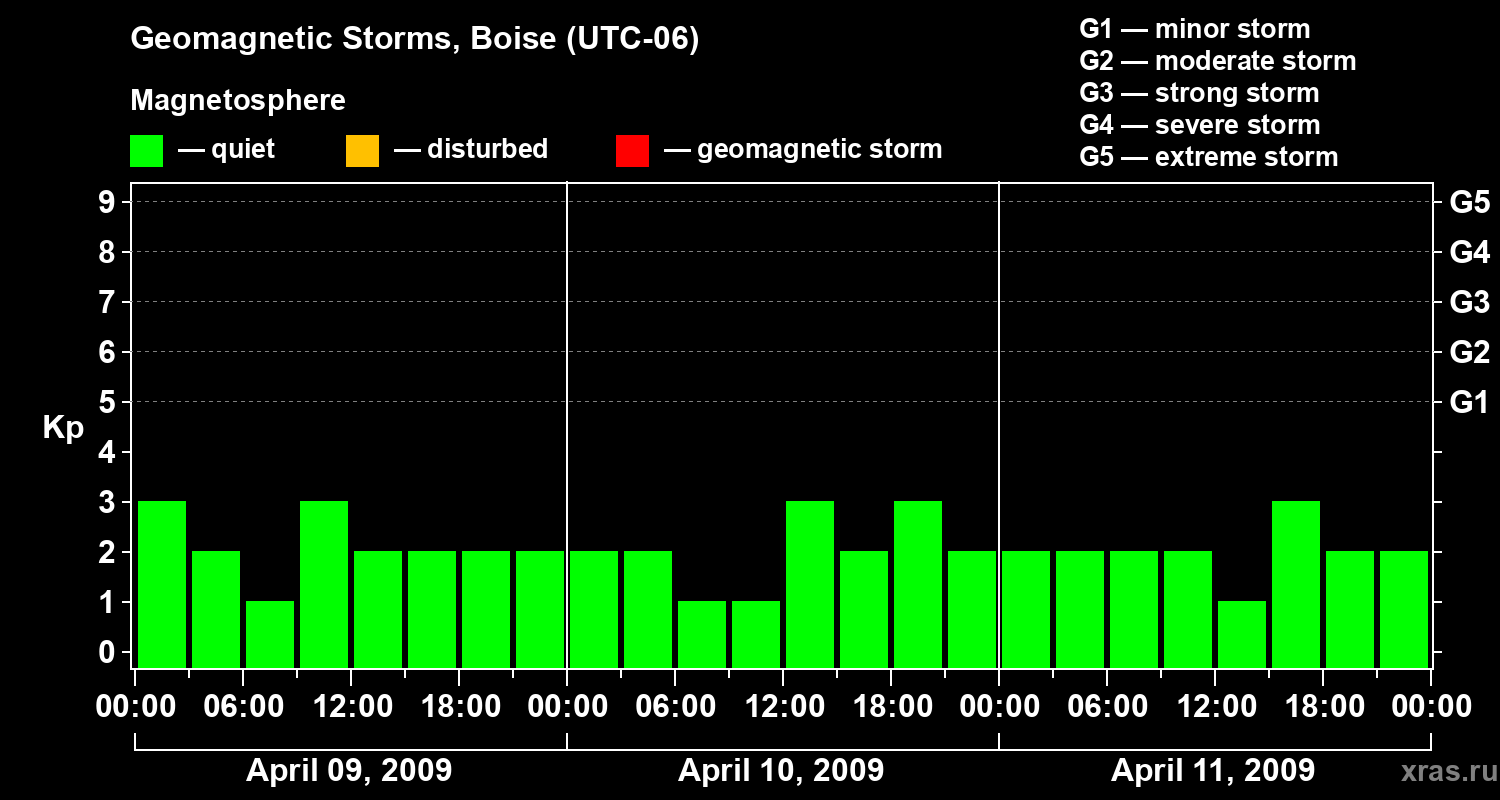 Changes in the geomagnetic index Kp from April 9 to 11, 2009 for mid latitudes