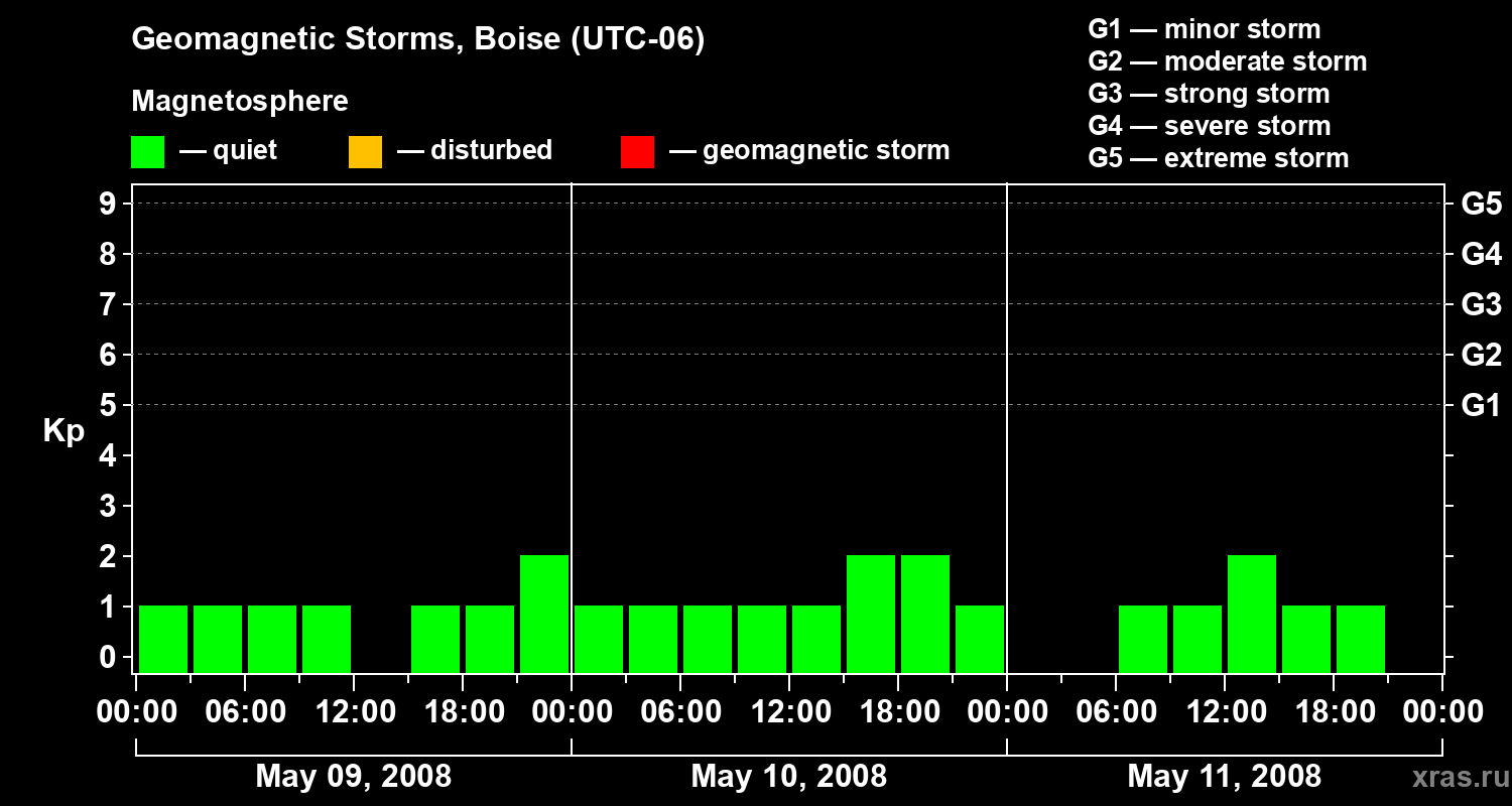 Changes in the geomagnetic index Kp from May 9 to 11, 2008 for mid latitudes