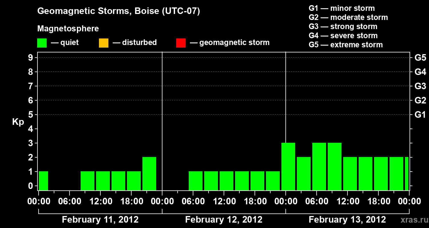Changes in the geomagnetic index Kp from February 11 to 13, 2012 for mid latitudes