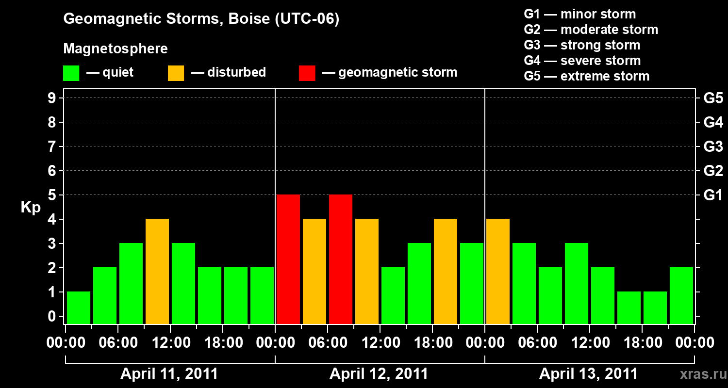 Changes in the geomagnetic index Kp from April 11 to 13, 2011 for mid latitudes