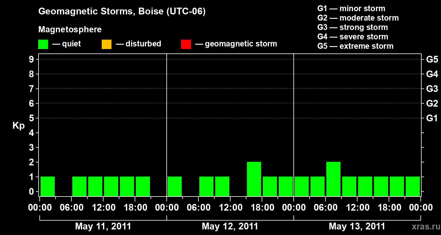 Changes in the geomagnetic index Kp from May 11 to 13, 2011 for mid latitudes