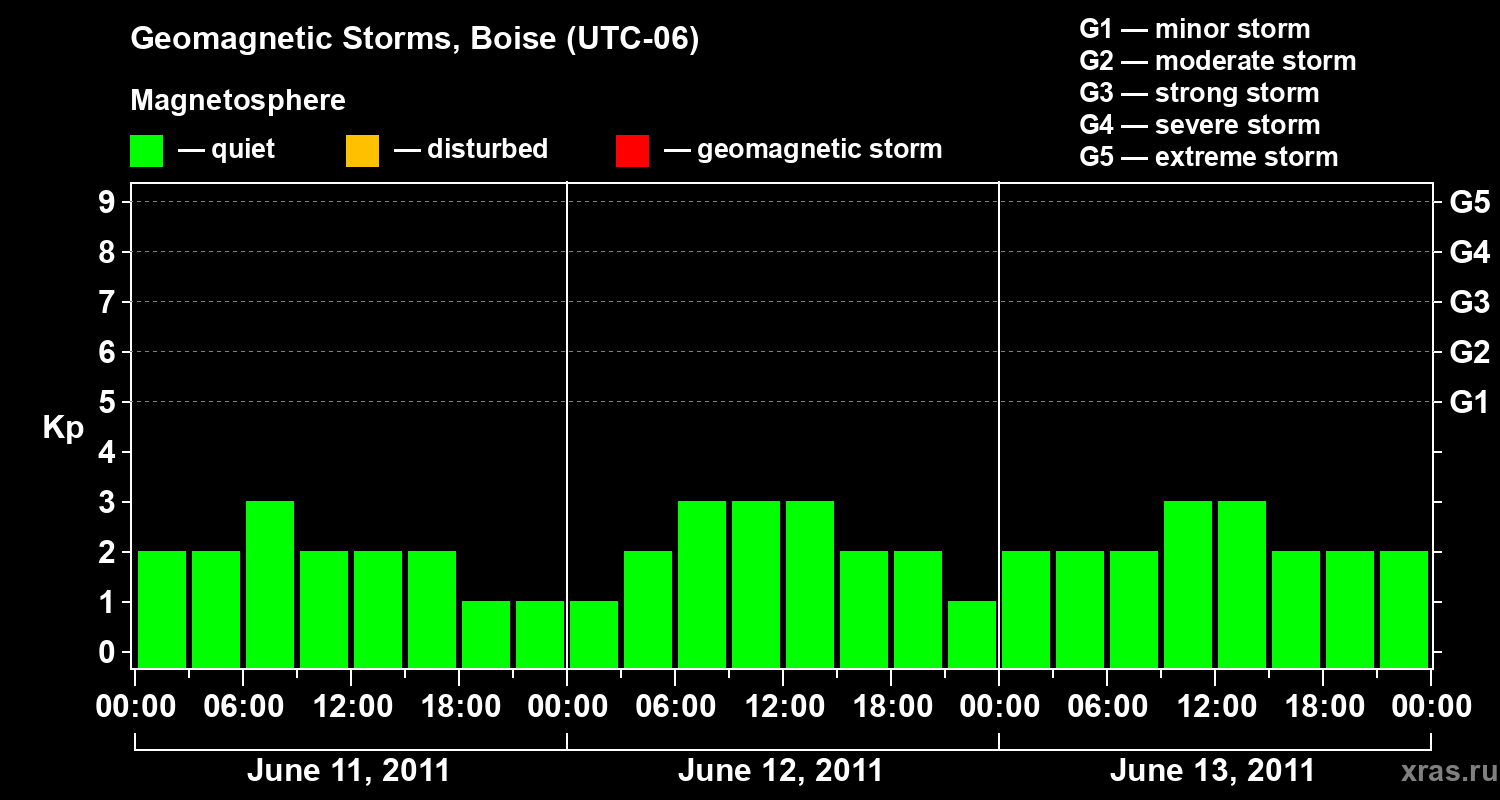 Changes in the geomagnetic index Kp from June 11 to 13, 2011 for mid latitudes
