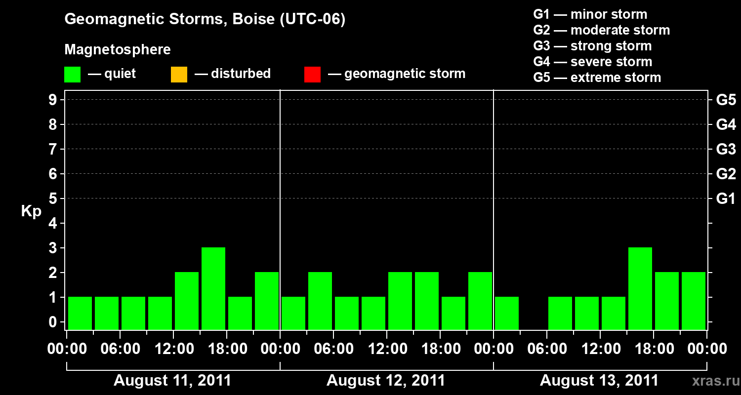Changes in the geomagnetic index Kp from August 11 to 13, 2011 for mid latitudes