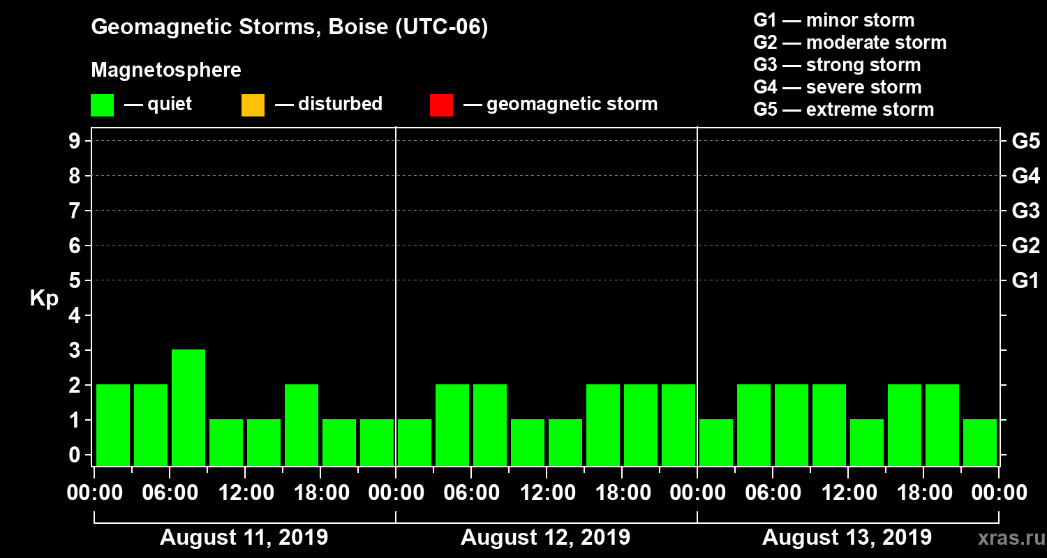 Changes in the geomagnetic index Kp from August 11 to 13, 2019 for mid latitudes