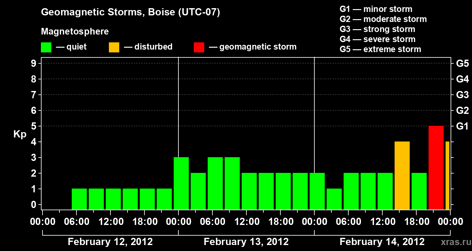 Changes in the geomagnetic index Kp from February 12 to 14, 2012 for mid latitudes
