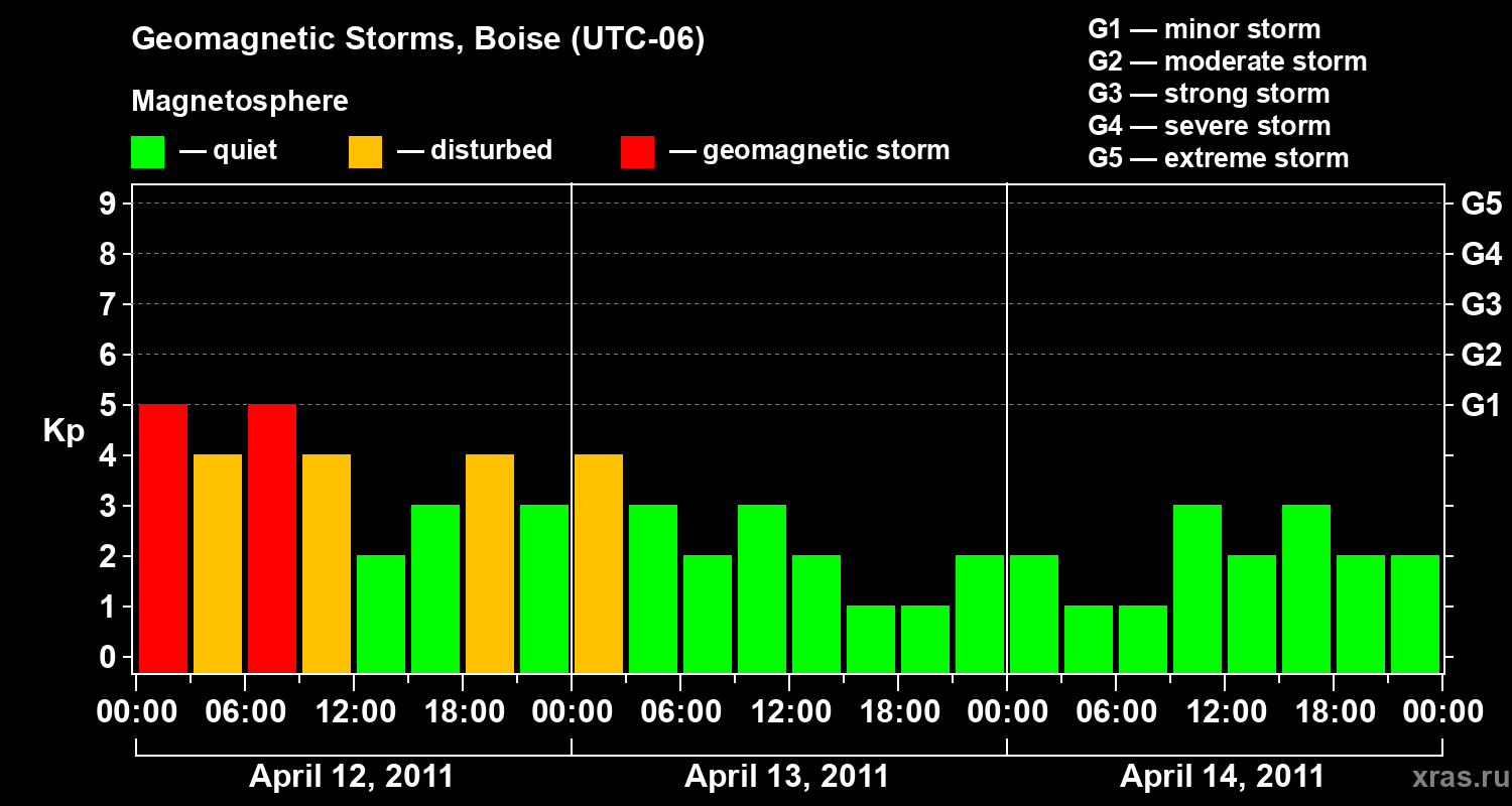 Changes in the geomagnetic index Kp from April 12 to 14, 2011 for mid latitudes