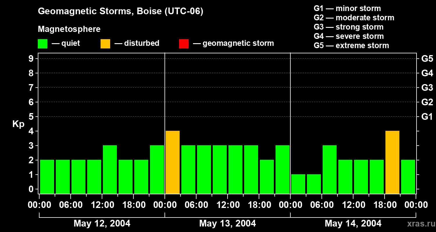 Changes in the geomagnetic index Kp from May 12 to 14, 2004 for mid latitudes
