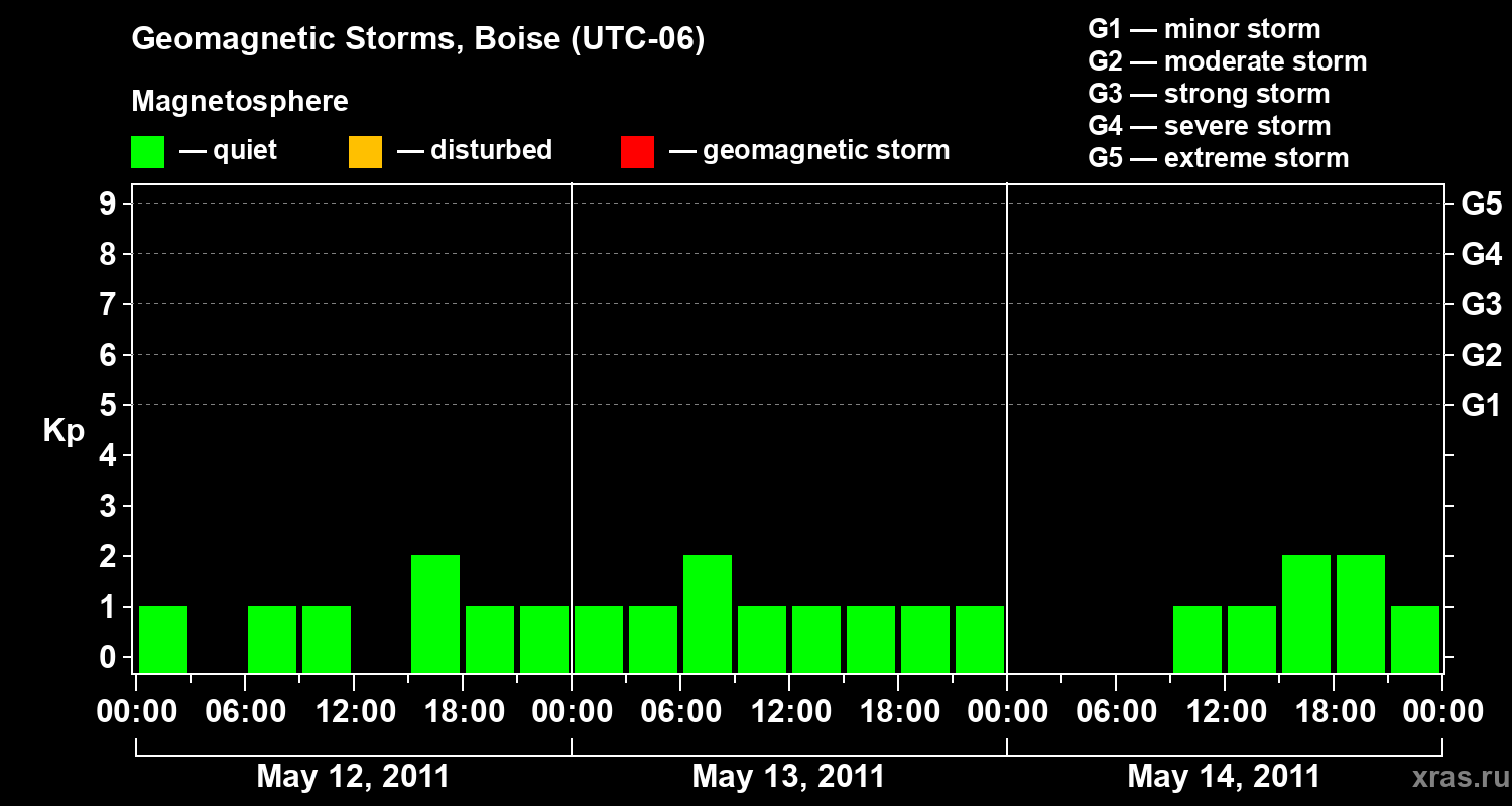 Changes in the geomagnetic index Kp from May 12 to 14, 2011 for mid latitudes