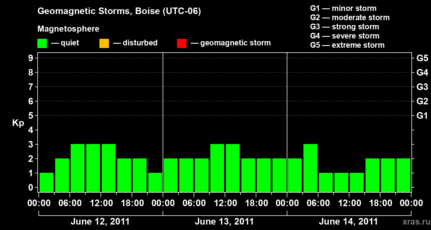 Changes in the geomagnetic index Kp from June 12 to 14, 2011 for mid latitudes