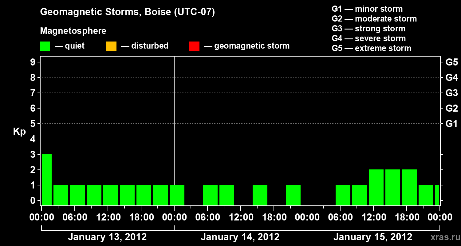 Changes in the geomagnetic index Kp from January 13 to 15, 2012 for mid latitudes