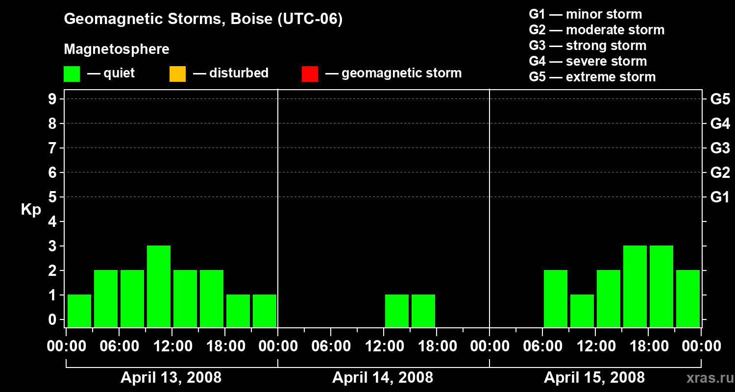 Changes in the geomagnetic index Kp from April 13 to 15, 2008 for mid latitudes