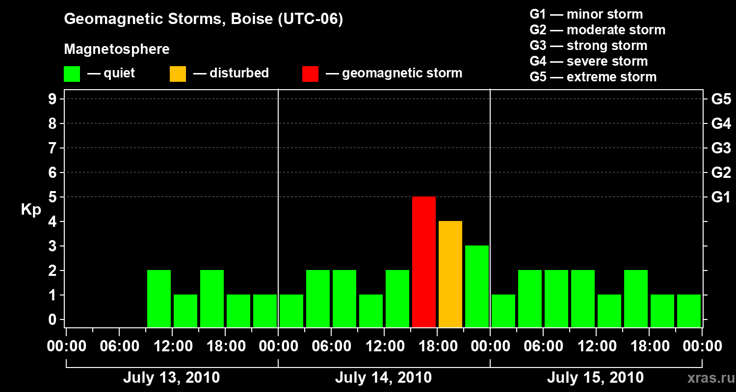 Changes in the geomagnetic index Kp from July 13 to 15, 2010 for mid latitudes