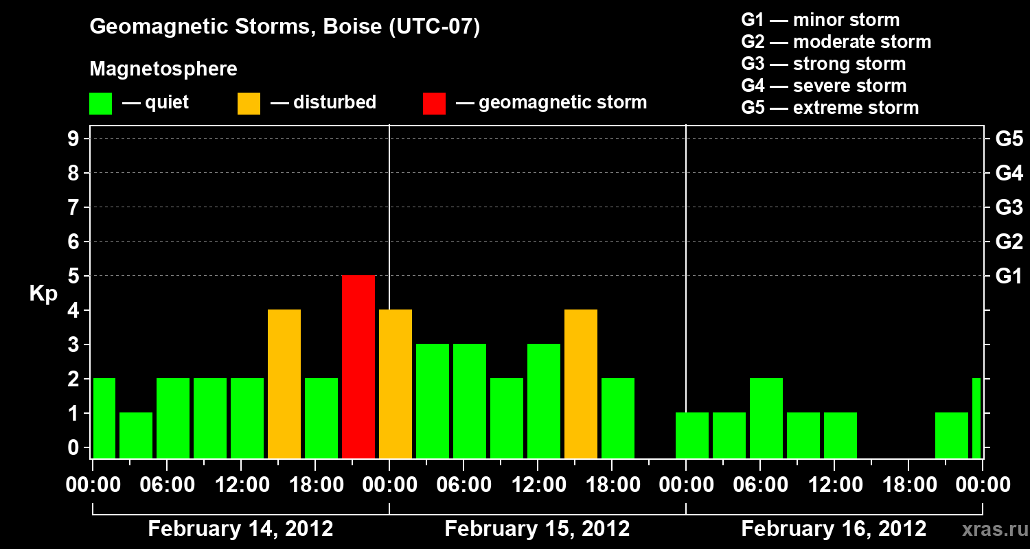Changes in the geomagnetic index Kp from February 14 to 16, 2012 for mid latitudes
