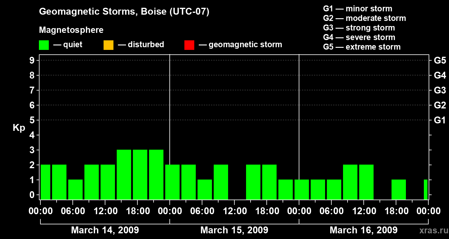 Changes in the geomagnetic index Kp from March 14 to 16, 2009 for mid latitudes