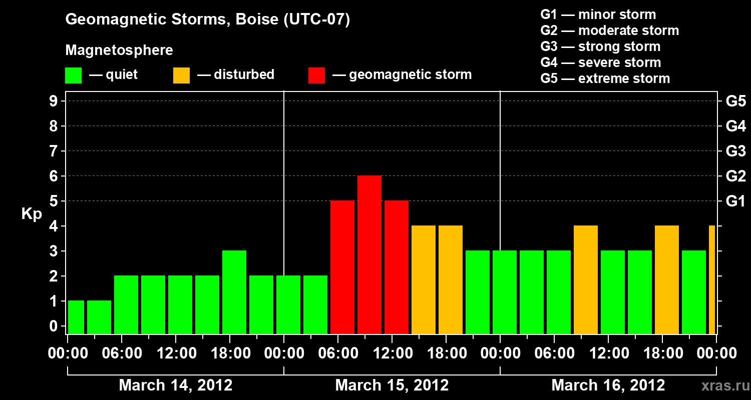 Changes in the geomagnetic index Kp from March 14 to 16, 2012 for mid latitudes
