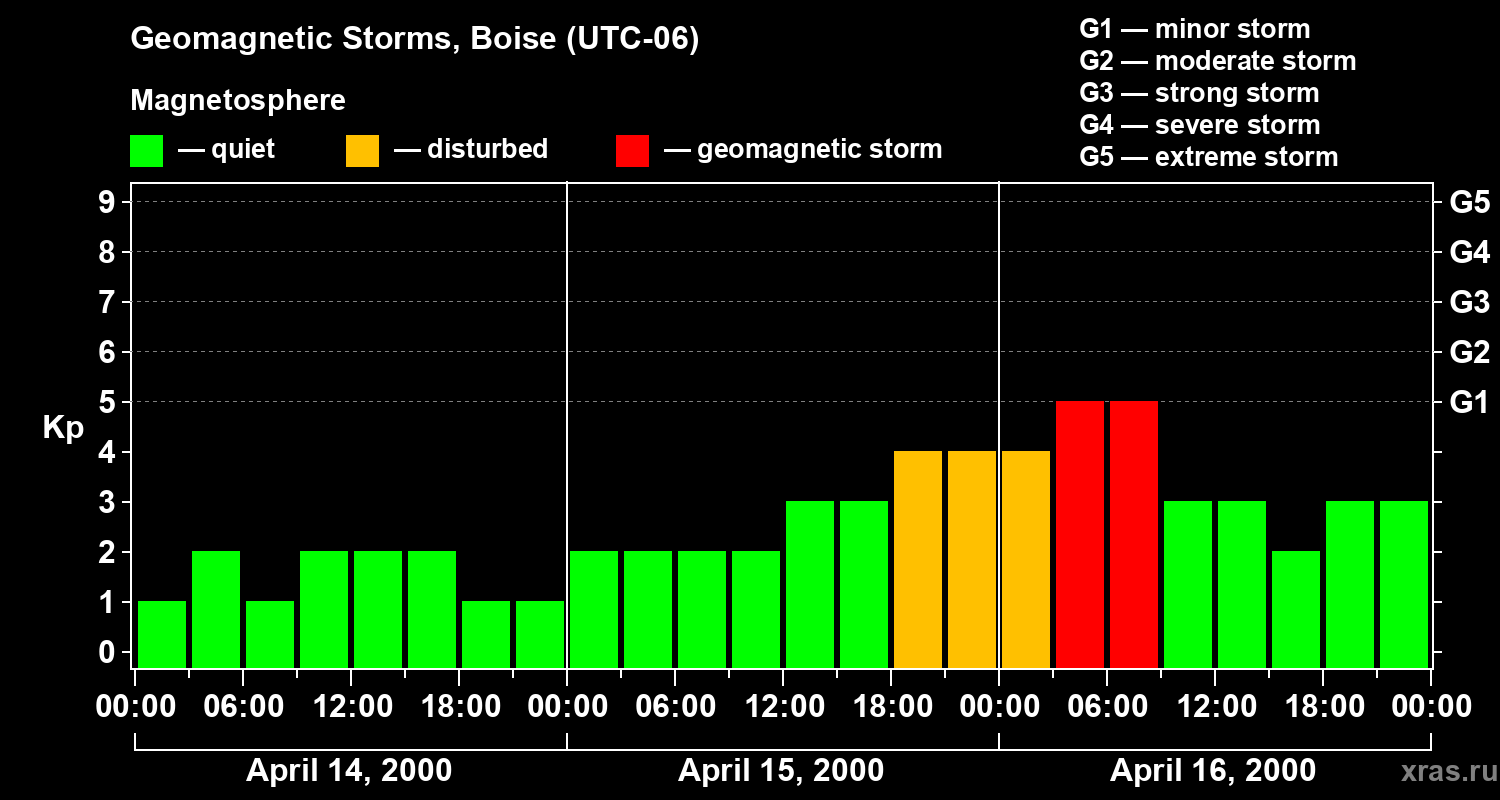 Changes in the geomagnetic index Kp from April 14 to 16, 2000 for mid latitudes
