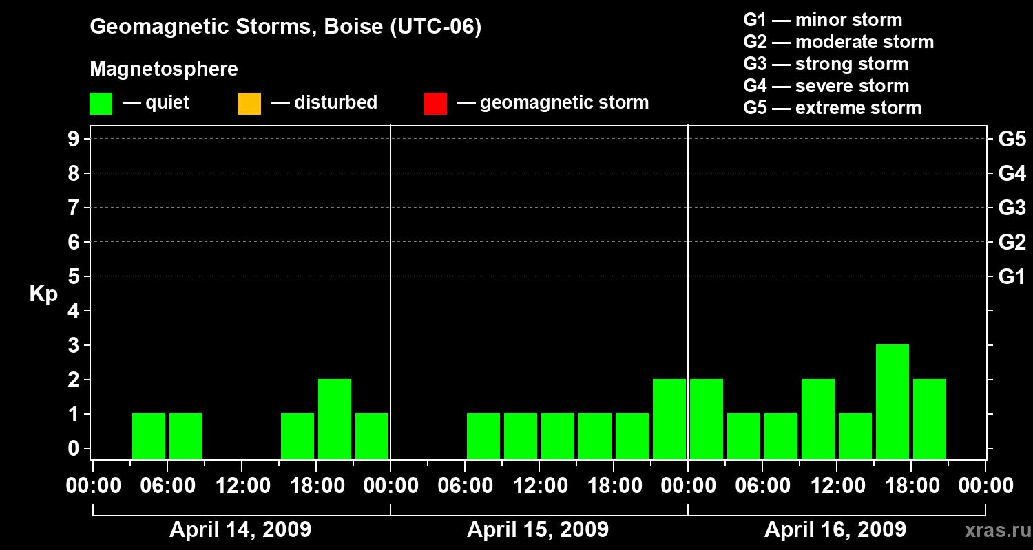Changes in the geomagnetic index Kp from April 14 to 16, 2009 for mid latitudes