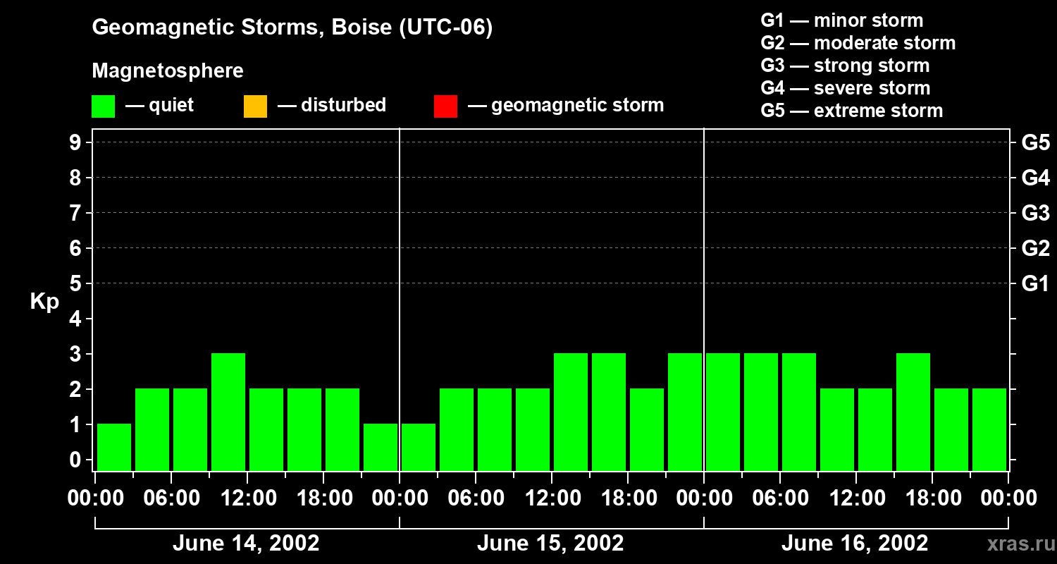 Changes in the geomagnetic index Kp from June 14 to 16, 2002 for mid latitudes