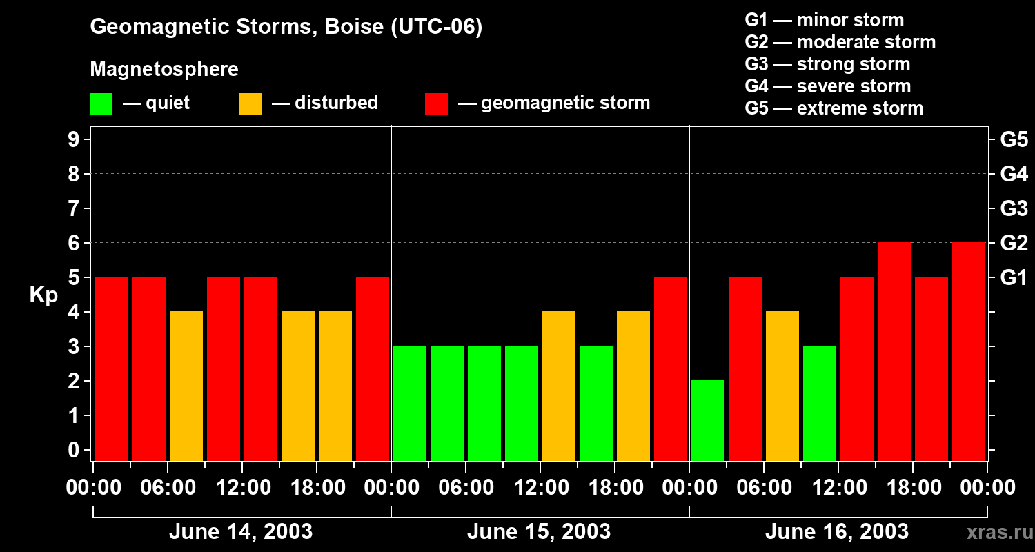 Changes in the geomagnetic index Kp from June 14 to 16, 2003 for mid latitudes