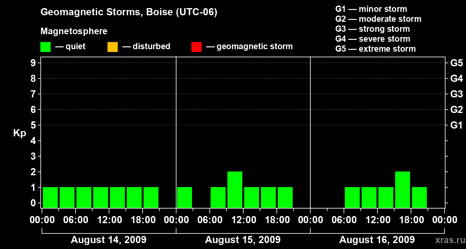 Changes in the geomagnetic index Kp from August 14 to 16, 2009 for mid latitudes
