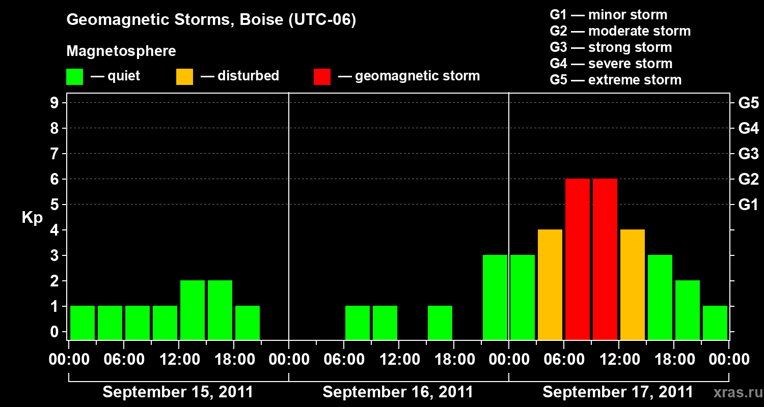Changes in the geomagnetic index Kp from September 15 to 17, 2011 for mid latitudes