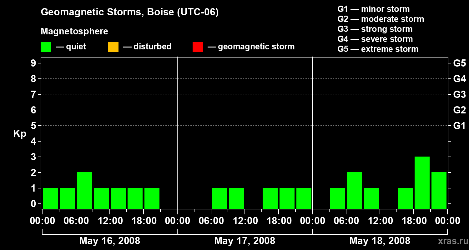 Changes in the geomagnetic index Kp from May 16 to 18, 2008 for mid latitudes