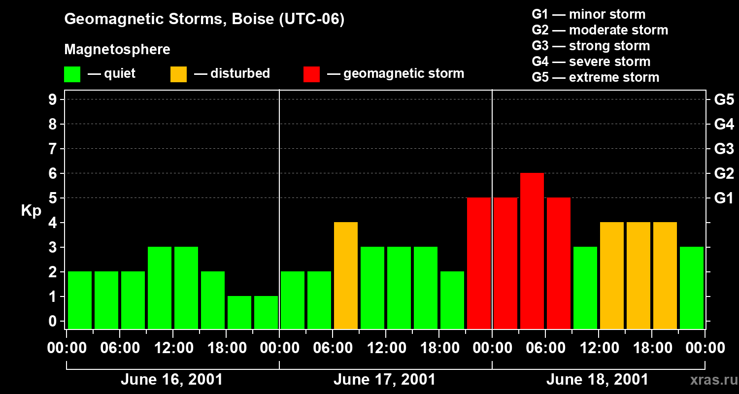 Changes in the geomagnetic index Kp from June 16 to 18, 2001 for mid latitudes