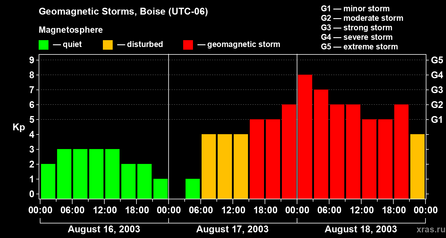 Changes in the geomagnetic index Kp from August 16 to 18, 2003 for mid latitudes