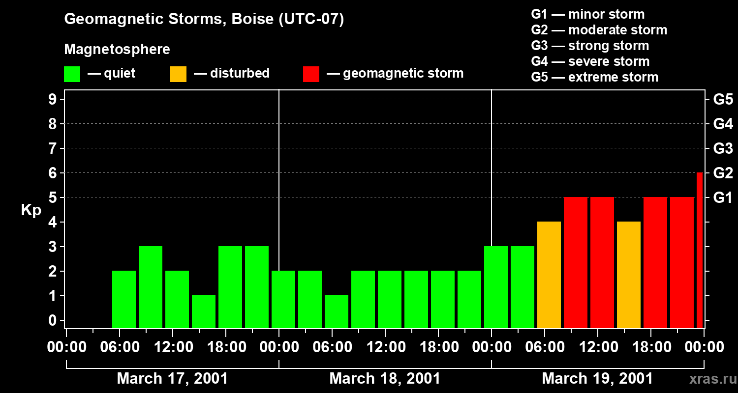 Changes in the geomagnetic index Kp from March 17 to 19, 2001 for mid latitudes