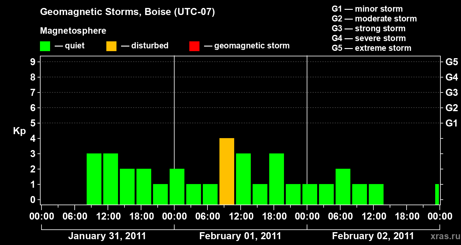 Changes in the geomagnetic index Kp from January 31 to February 2, 2011 for mid latitudes