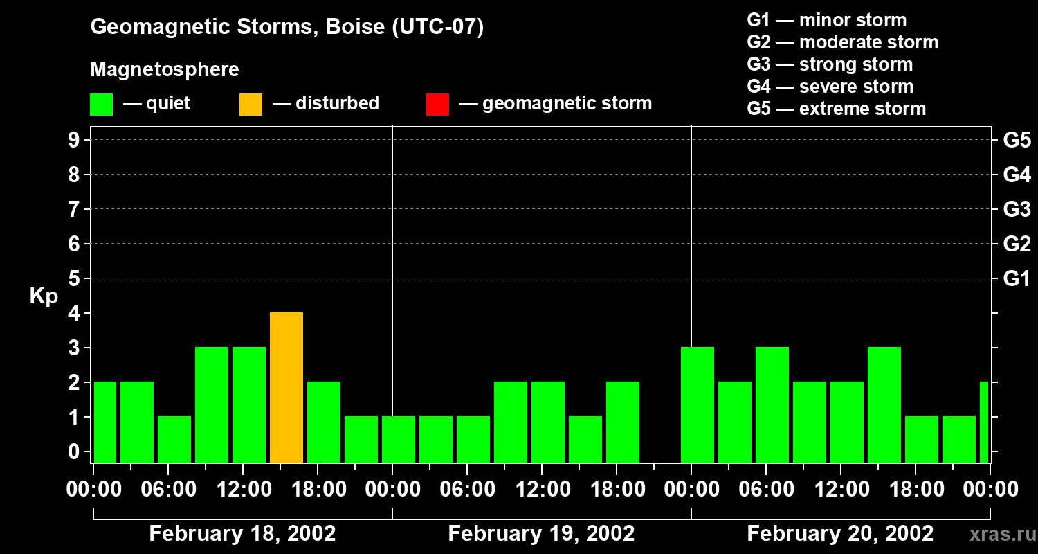 Changes in the geomagnetic index Kp from February 18 to 20, 2002 for mid latitudes