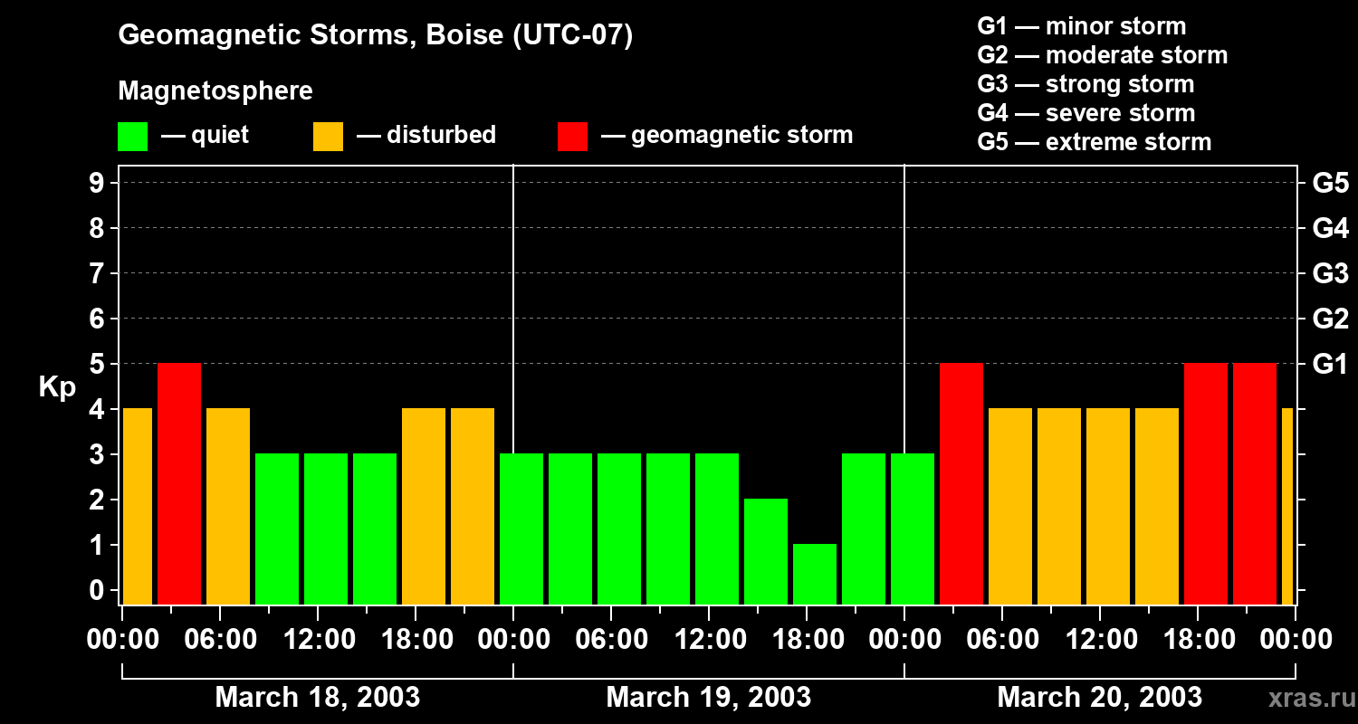 Changes in the geomagnetic index Kp from March 18 to 20, 2003 for mid latitudes