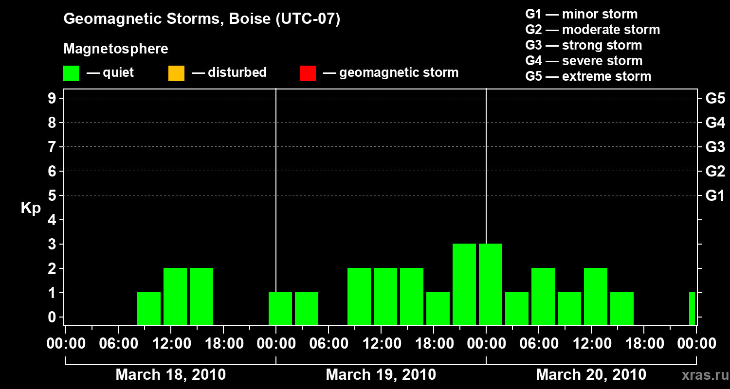 Changes in the geomagnetic index Kp from March 18 to 20, 2010 for mid latitudes